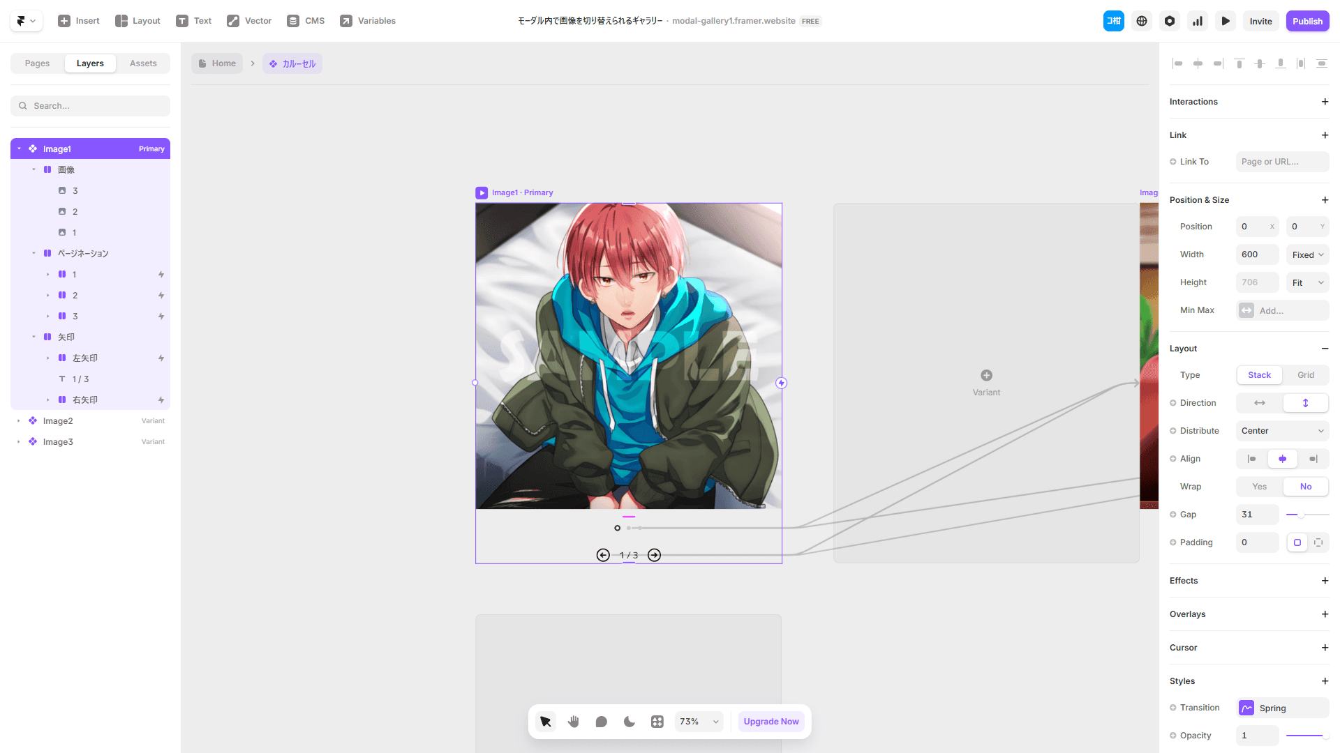 今回は画像が3枚なので、3つのVariantを用意して、必要なら矢印やページネーションを配置する